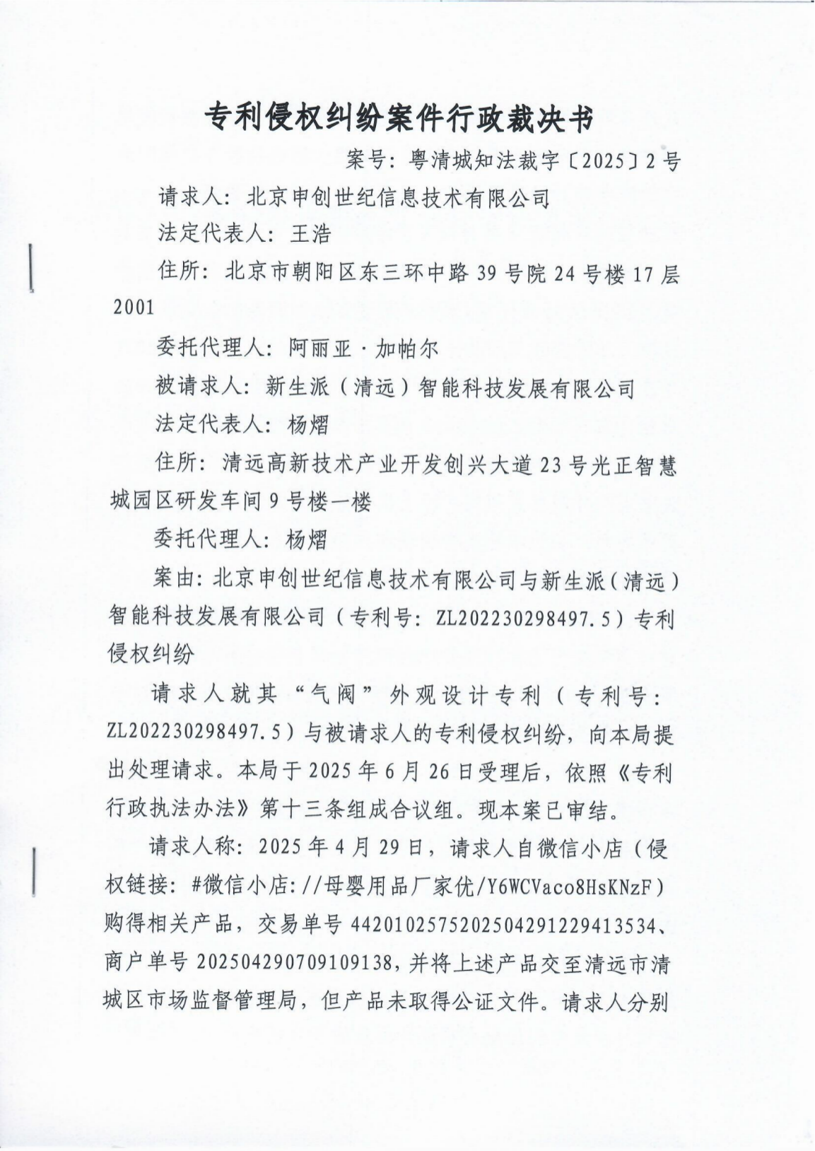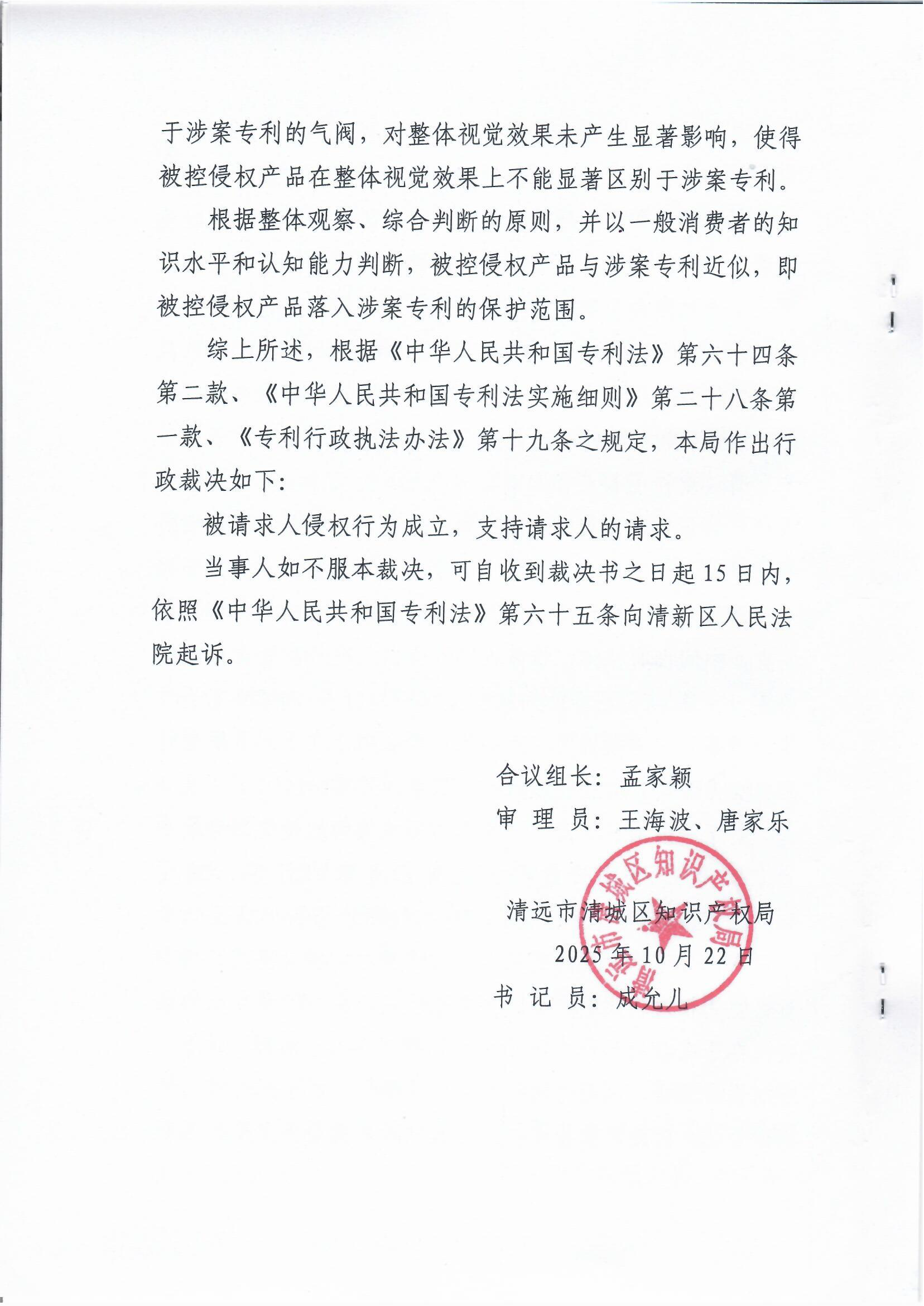 專利侵權(quán)糾紛案件行政裁決書(粵清城知法裁字〔2025〕2號)