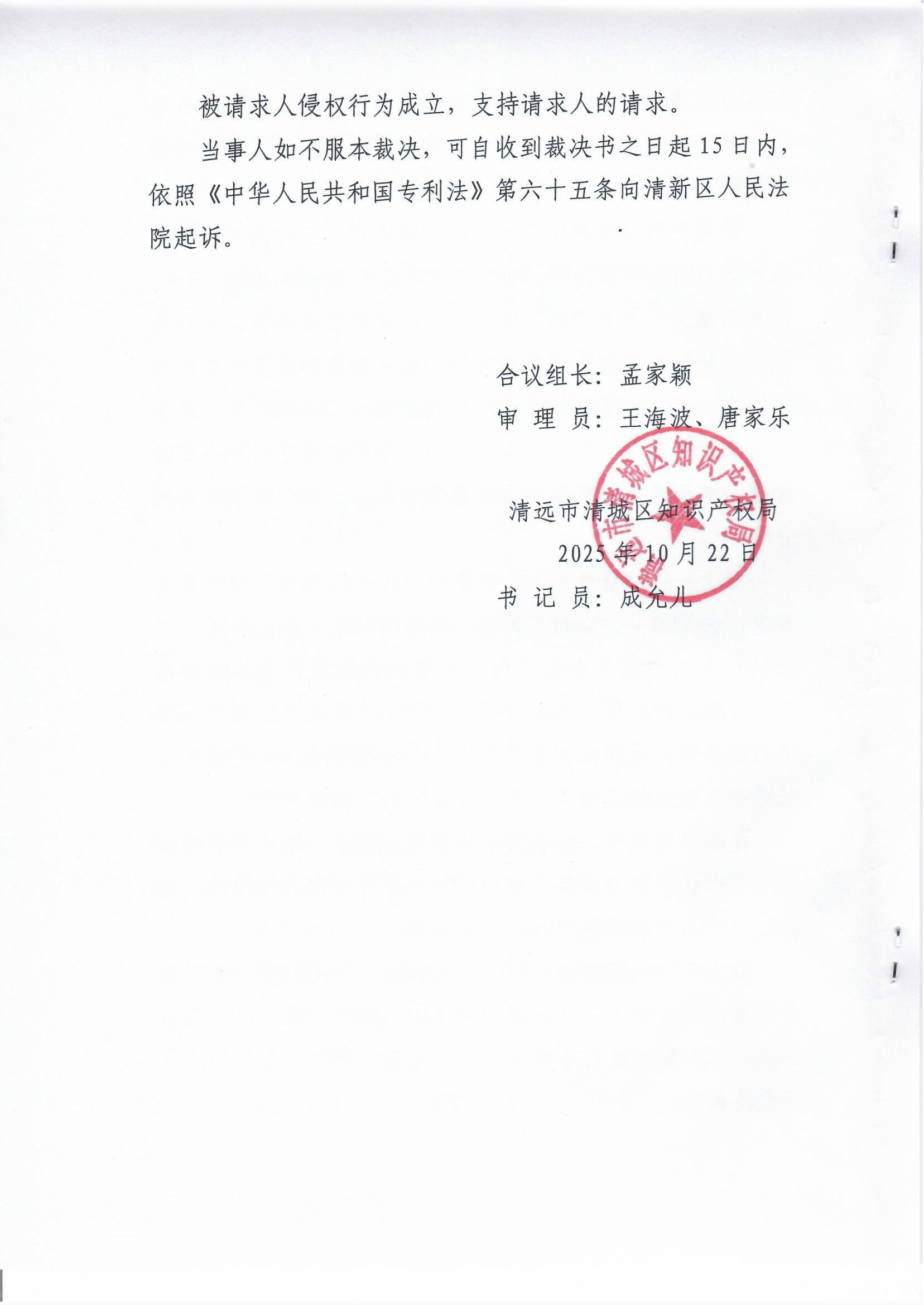 專利侵權(quán)糾紛案件行政裁決書(shū)(粵清城知法裁字〔2025〕3號(hào))