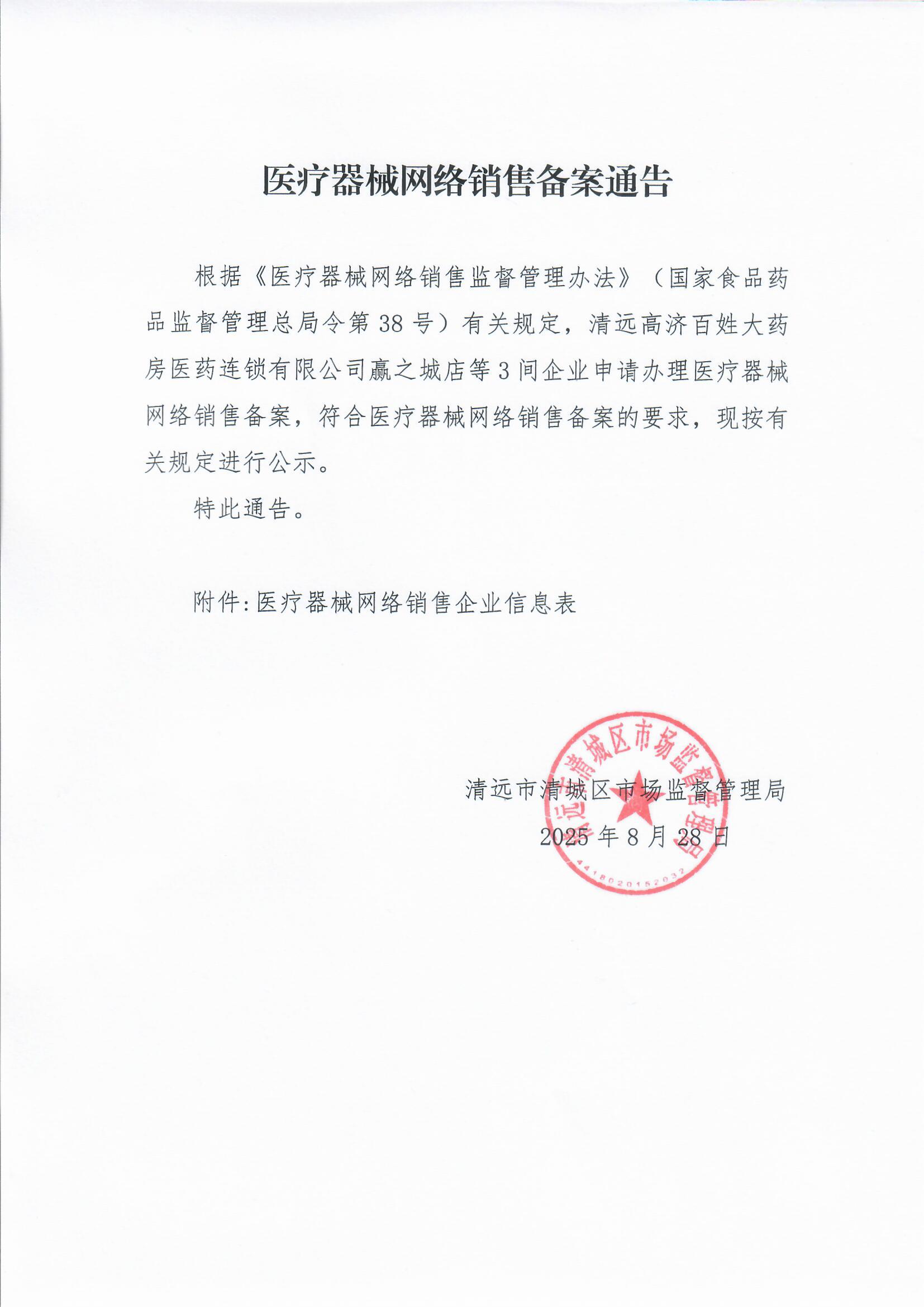 3 | 變更備案 | (清城)網(wǎng)械銷售備字 ﹝2024﹞第026號(hào) | 2025/8/14 | 清遠(yuǎn)高濟(jì)百姓大藥房醫(yī)藥連鎖有限公司光明市場(chǎng)店 | 入駐類 | 914418020667446003 | 清遠(yuǎn)市新城東十號(hào)區(qū)時(shí)代天驕花園B幢首層?xùn)|07號(hào) | ****** | 餓了么;京東到家;高濟(jì)藥急送;美團(tuán)網(wǎng);抖店、抖音電商 | (滬)網(wǎng)械平臺(tái)備字(2018)第00004號(hào);(滬)網(wǎng)械平臺(tái)備字(2018)第00002號(hào);(京)網(wǎng)械平臺(tái)備字(2020)第00010號(hào);(京)網(wǎng)械平臺(tái)備字(2018)第00004號(hào);(滬)網(wǎng)械平臺(tái)備字[2022]第00002號(hào) | 無(wú) | 無(wú) | 無(wú) | 無(wú) | 無(wú) | 無(wú) |