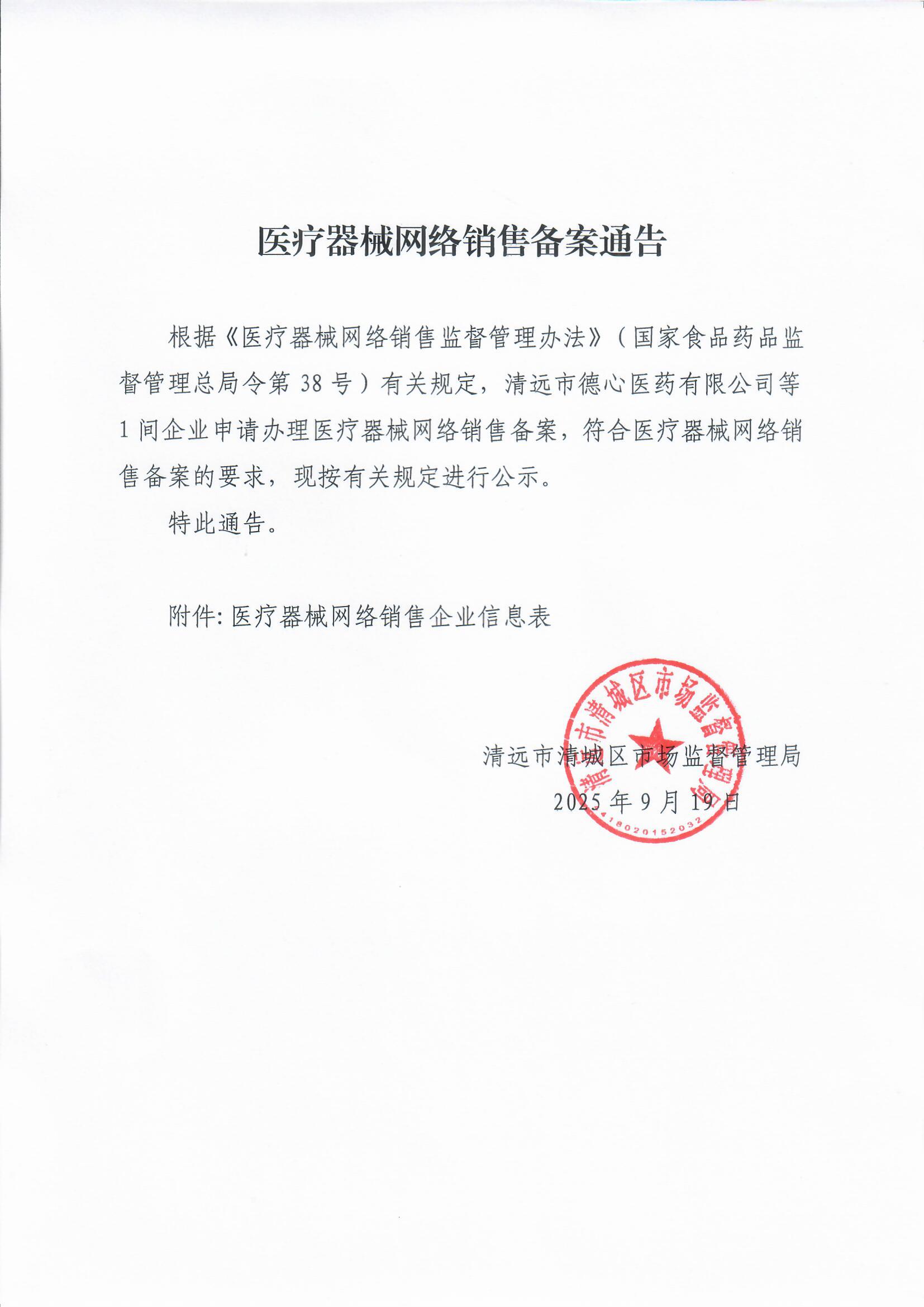 1 | 首次備案 | (清城)網(wǎng)械銷售備字 ﹝2025﹞第34號 | 2025/9/11 | 清遠(yuǎn)市德心醫(yī)藥有限公司 | 入駐類 | 91441802MAE5BWQY8P | 清遠(yuǎn)市清城區(qū)城北二路西25座君華大廈首層商鋪02號 | ****** | 美團(tuán)網(wǎng);拼多多商城 | (京)網(wǎng)械平臺備字(2018)第00004號;(瀘)網(wǎng)械平臺備字[2018]第00003號 | 無 | 無 | 無 | 無 | 無 | 無 |