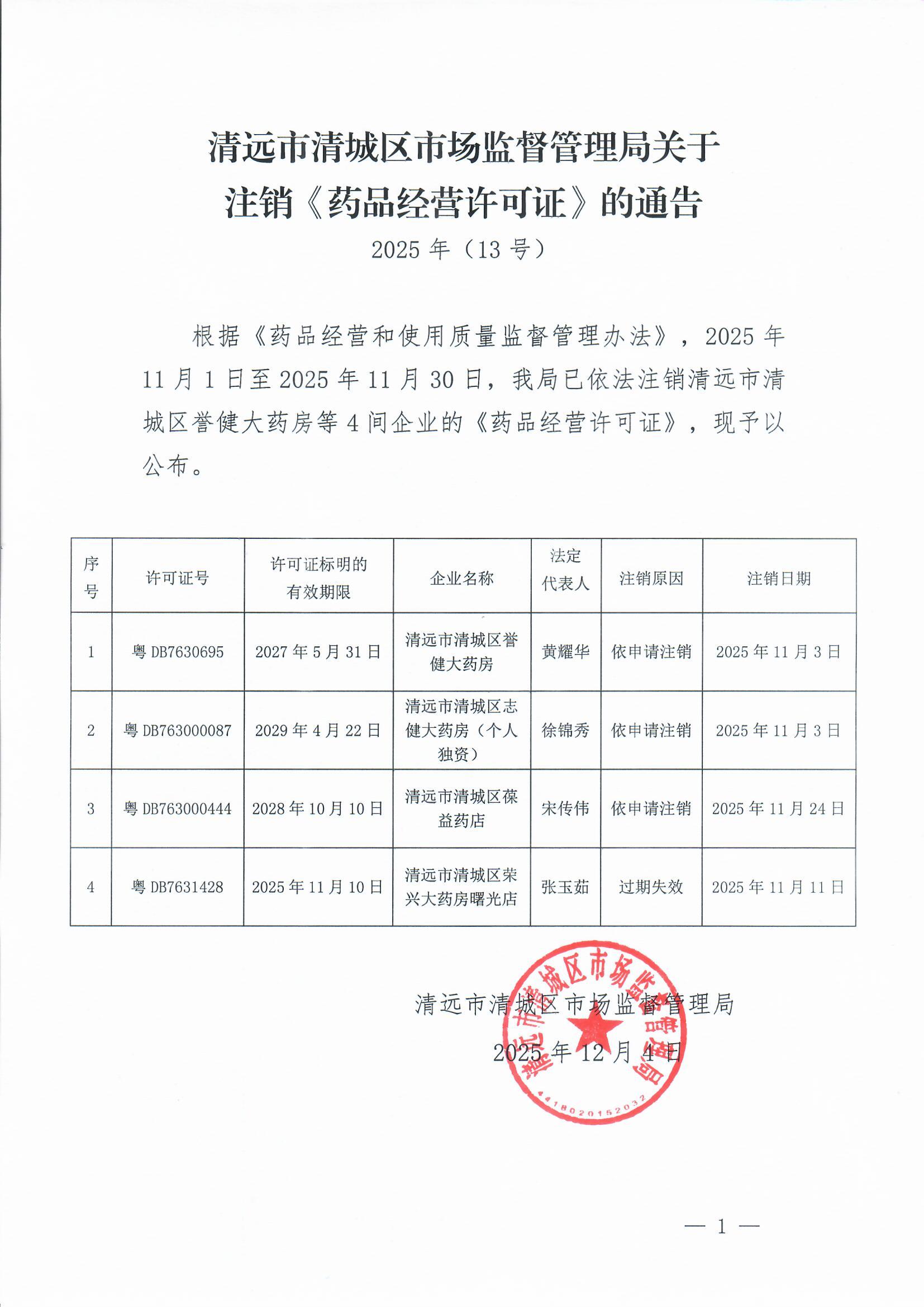 清遠(yuǎn)市清城區(qū)市場(chǎng)監(jiān)督管理局關(guān)于注銷《藥品經(jīng)營許可證》的通告(2025年(13號(hào)))