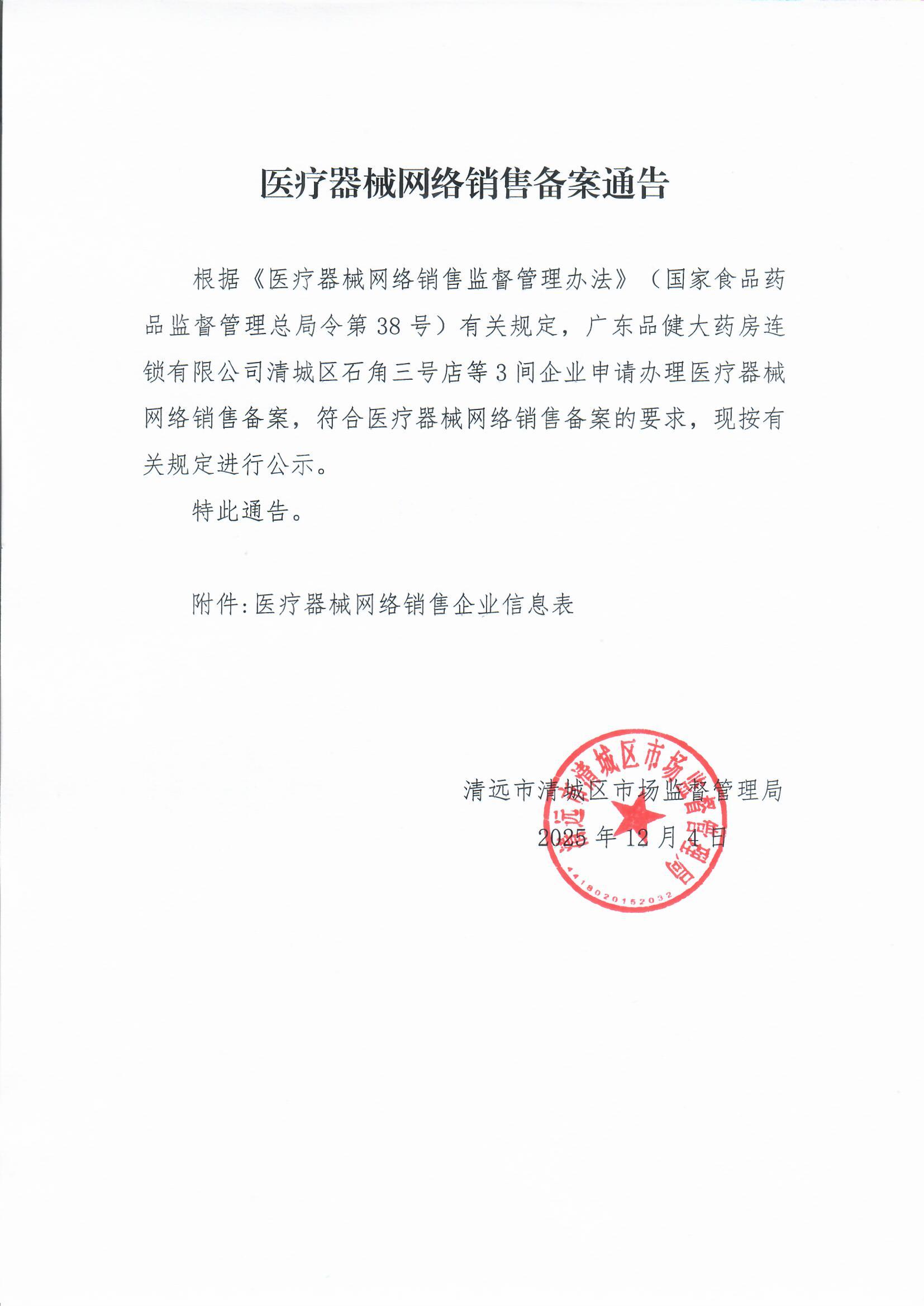 2 | 首次備案 | (清城)網(wǎng)械銷(xiāo)售備字 ﹝2025﹞第48號(hào) | 2025/12/1 | 廣東品健大藥房連鎖有限公司清城區(qū)石角三號(hào)店 | 入駐類(lèi) | 91441802MADE68W87E | 清遠(yuǎn)市清城區(qū)石角鎮(zhèn)福源街一幢第三號(hào)、東十二幢188號(hào) | ****** | 抖店、抖音電商;京東到家;餓了么;美團(tuán)網(wǎng);拼多多商城;天貓 | (滬)網(wǎng)械平臺(tái)備字[2022]第 00002 號(hào);(滬)網(wǎng)械平臺(tái)備字[2018]第 00002 號(hào);(滬)網(wǎng)械平臺(tái)備字[2018]第 00004 號(hào);(京)網(wǎng)械平臺(tái)備字(2018)第 00004 號(hào);(滬)網(wǎng)械平臺(tái)備字[2018]第 00003 號(hào);(浙)網(wǎng)械平臺(tái)備字[2018]第 00002 號(hào) | 無(wú) | 無(wú) | 無(wú) | 無(wú) | 無(wú) | 無(wú) |