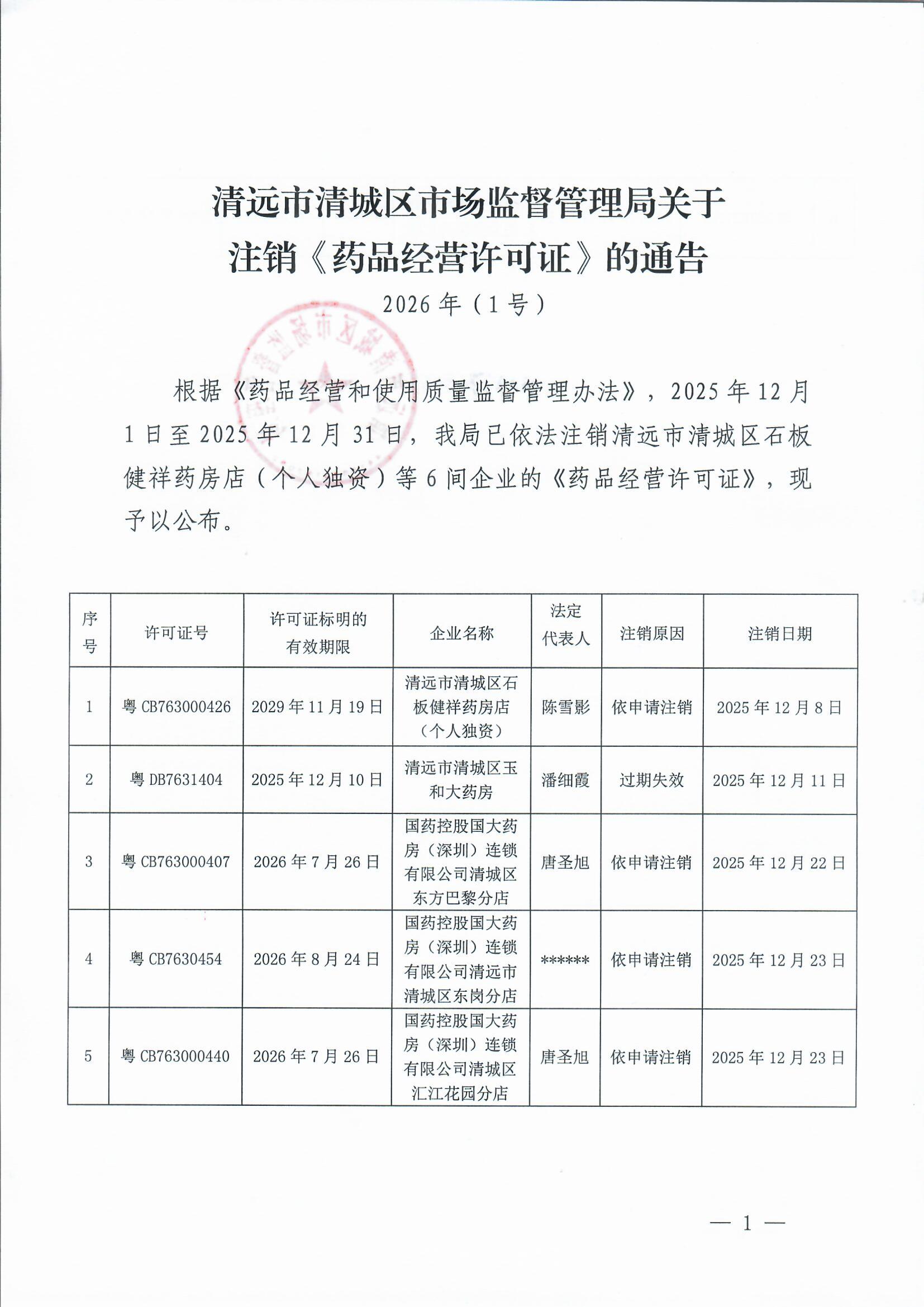 清遠(yuǎn)市清城區(qū)市場監(jiān)督管理局關(guān)于注銷《藥品經(jīng)營許可證》的通告(2026年(1號))