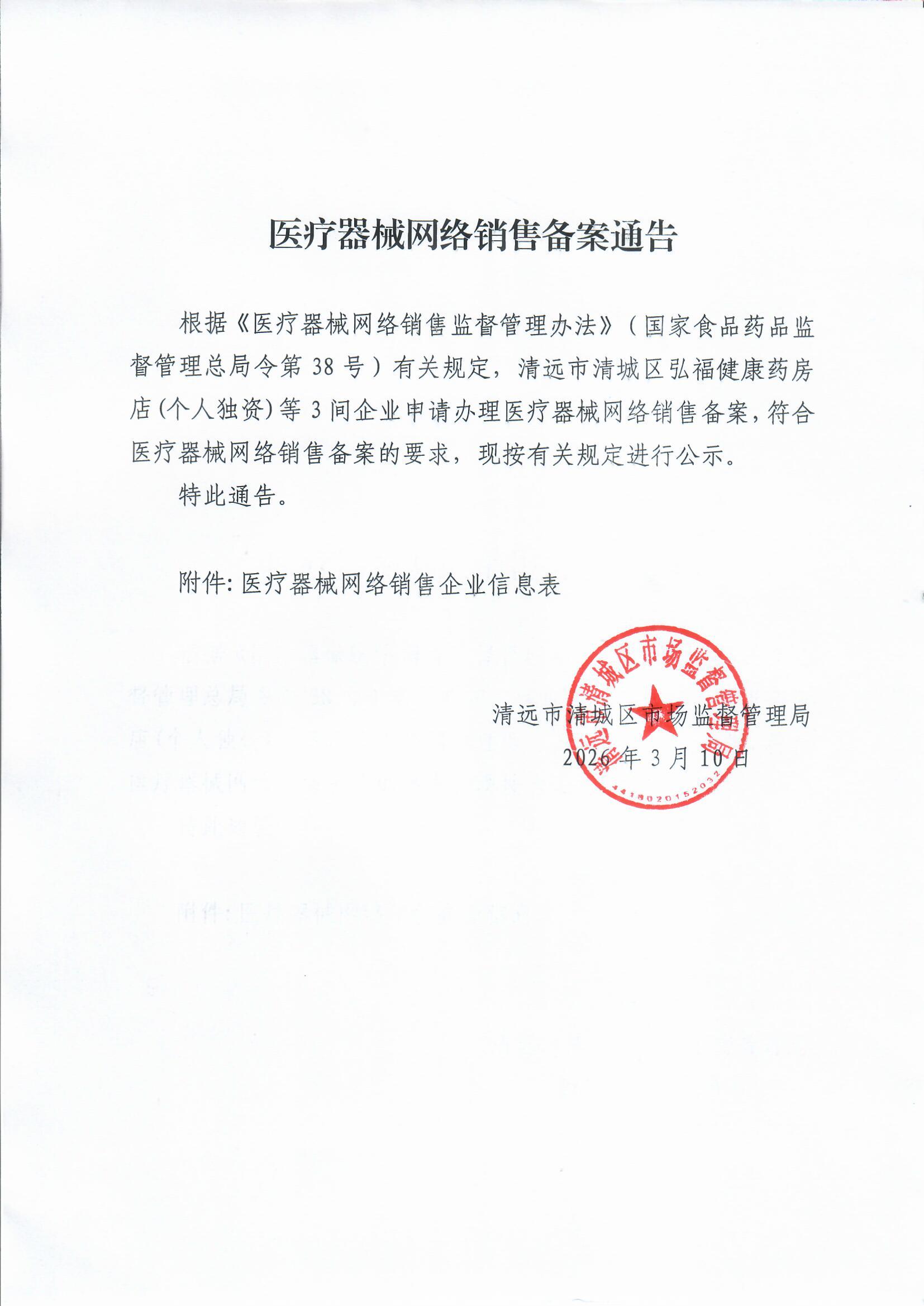 1 | 首次備案 | (清城)網(wǎng)械銷售備字 ﹝2026﹞第4號(hào) | 2026/3/3 | 清遠(yuǎn)市清城區(qū)弘福健康藥房店(個(gè)人獨(dú)資) | 粵清藥監(jiān)械經(jīng)營備20260023號(hào),粵清藥監(jiān)械經(jīng)營許20260037號(hào) | 91441802MAK586YW6A | 清遠(yuǎn)市新城銀泉南路十五號(hào)弘?;▓@一幢首層01、02號(hào) | ****** | 京東到家;淘寶閃購;抖店、抖音電商;美團(tuán)網(wǎng);高濟(jì)藥急送、高濟(jì)健康Pro | (滬)網(wǎng)械平臺(tái)備字[2018]第00002號(hào);(滬)網(wǎng)械平臺(tái)備字[2018]第00004號(hào);(滬)網(wǎng)械平臺(tái)備字[2022]第00002號(hào);(京)網(wǎng)械平臺(tái)備字(2018)第00004號(hào);(滬)網(wǎng)械平臺(tái)備字[2025]第00003號(hào) | 無 | 無 | 無 | 無 | 無 | 無 |