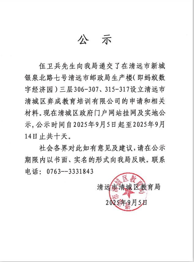 關(guān)于伍衛(wèi)兵先生申請(qǐng)?jiān)O(shè)立清遠(yuǎn)市清城區(qū)弈成教育培訓(xùn)有限公司的公示